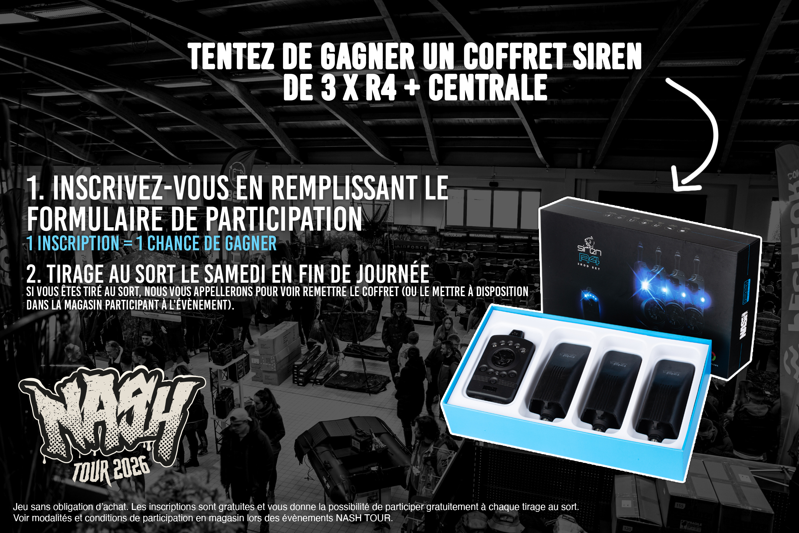 Nous vous faisons gagner un coffret de 3X R4 avec centrale SIREN lors de chaque weekend des NASH TOUR. Pour participer, inscrivez-vous ci-dessous. 1 inscription = 1 chance de gagner le coffret de R4. Bonne chance à tous !